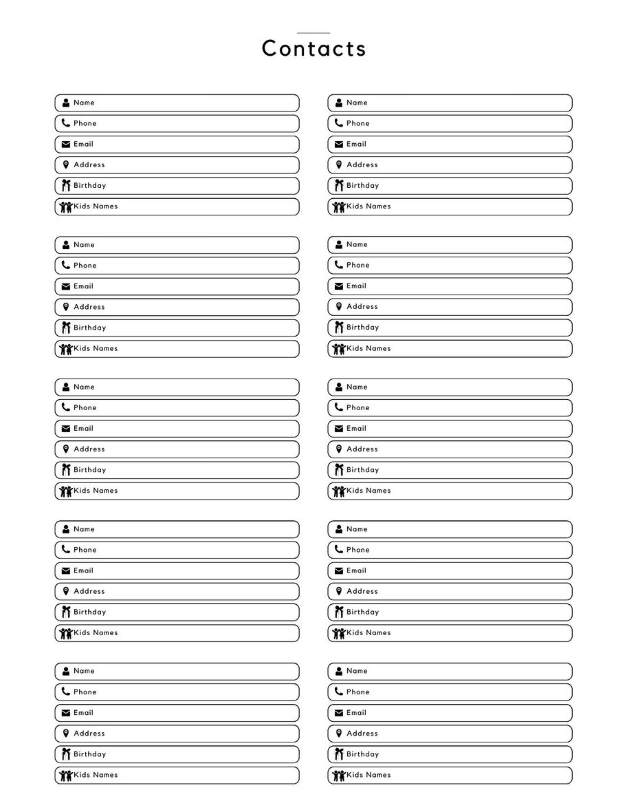 - Additional Sections: Passwords, Contacts (with space for birthdays and kids' names), Lined Note Pages